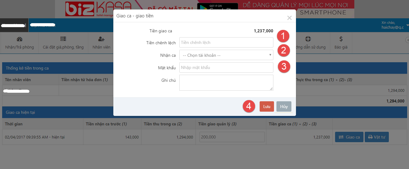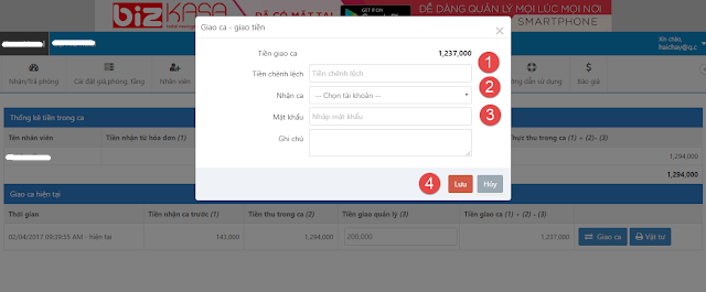 Hướng dẫn sử dụng chức năng giao ca – Phần mềm quản lý nhà nghỉ online bizkasa